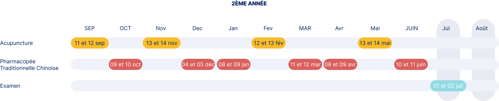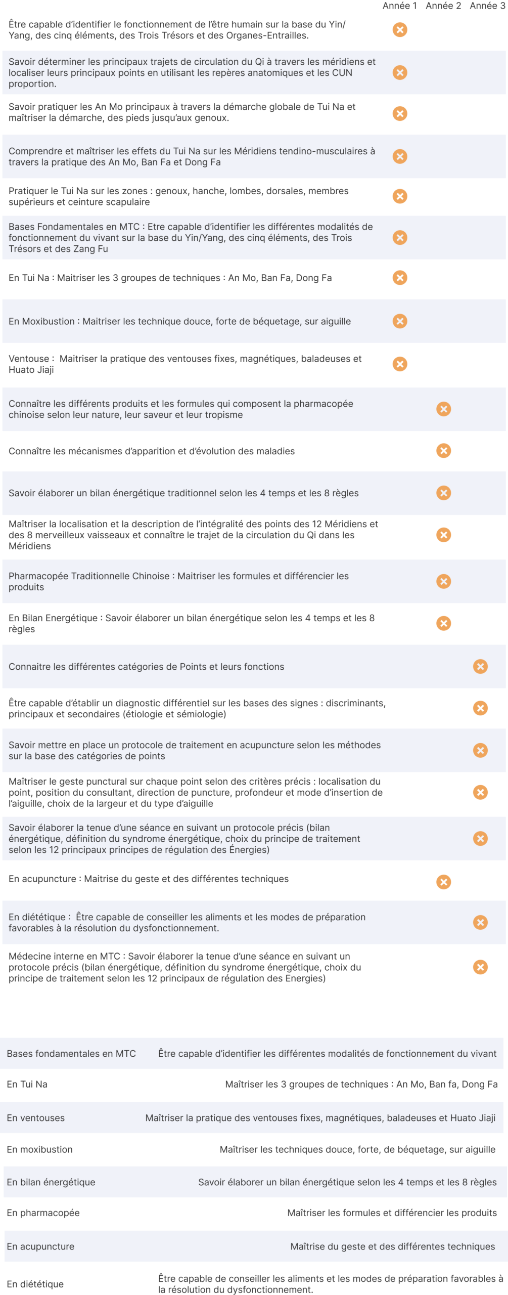 • Les quatre temps • Les huit règles • Les Six niveaux • Les Cinq éléments • Les pathologies Gynécologiques • Les pathologies dermatologiques • Emotions • Maladies courantes • Gestion du stress et du burn-out • Gestion des traumatismes Deux jours certifiants basés sur la pratique et la théorie. Partez 15 jours à la découverte de la médecine traditionnelle chinoise en Chine en hôpital, en pharmacie (pharmacopée) et à l'Université de Nianjing.